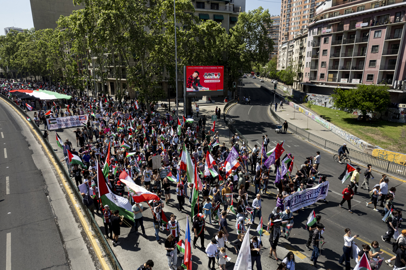 Şili'deki Filistin Toplumu, İsrail saldırılarında hayatını kaybedenleri anmak ve Gazze'de ateşkes talebiyle düzenledikleri gösteride dev Filistin bayrağı açtı.