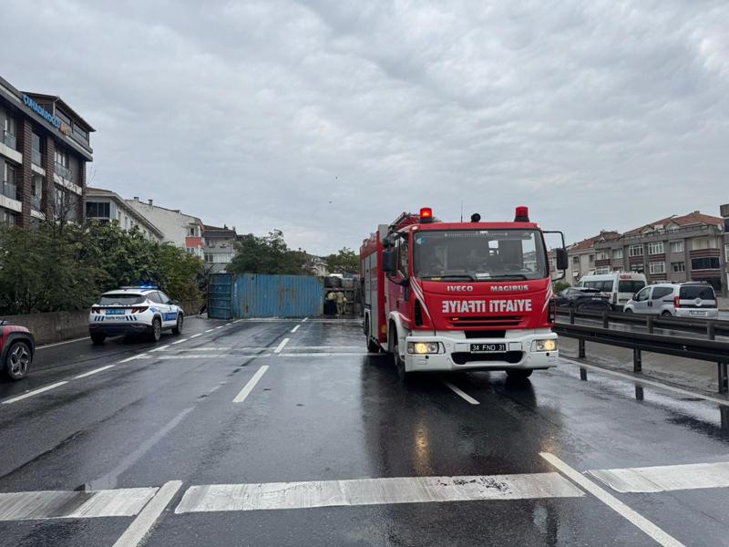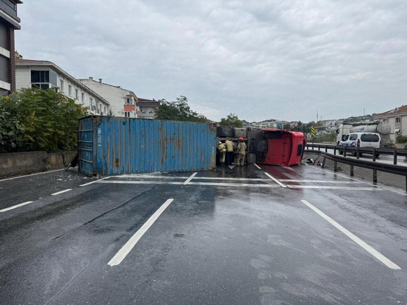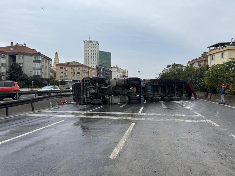 D-100 kara yolu Edirne istikametinde seyir halinde olan ve sürücüsünün ismi öğrenilemeyen 59 AAR 214 plakalı tır, Büyükçekmece mevkisinde yağışın etkisiyle kayganlaşan yolda, kontrolden çıkarak devrildi.