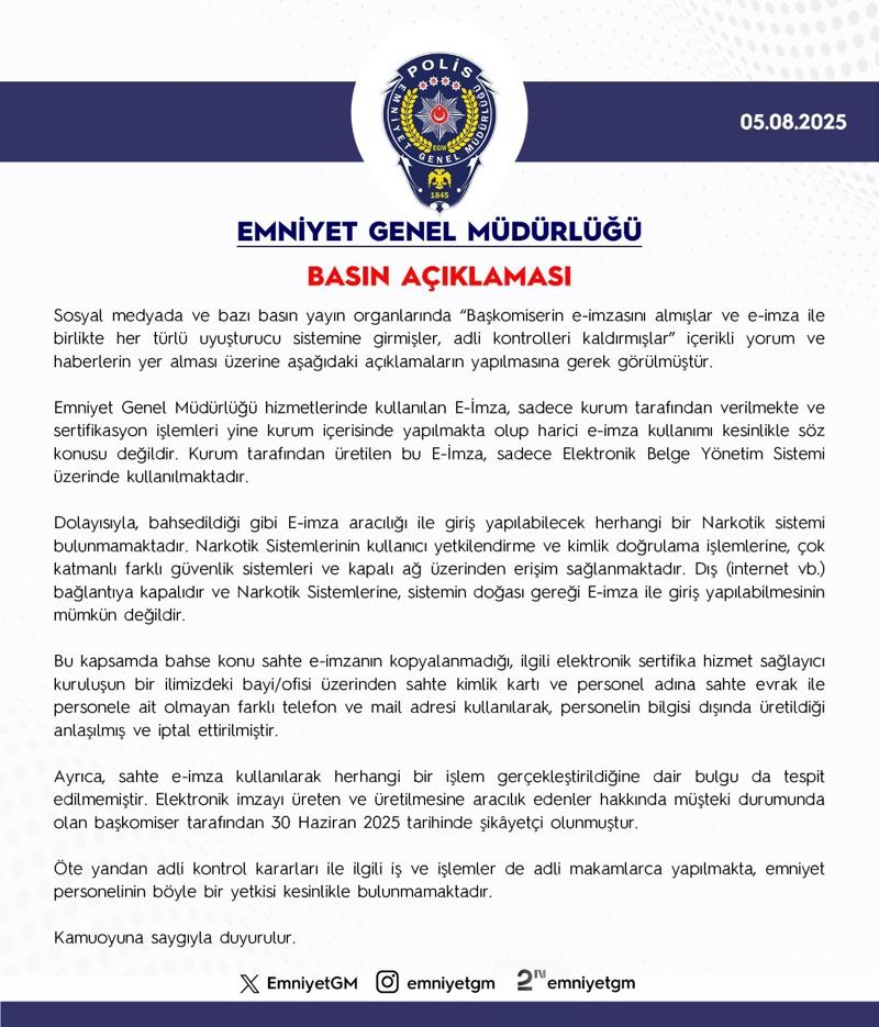Sosyal medyada ve bazı basın yayın organlarında "Başkomiserin E-imzasını almışlar ve E-imza ile birlikte her türlü uyuşturucu sistemine girmişler, adli kontrolleri kaldırmışlar" içerikli yorum ve haberlerin yer alması üzerine aşağıdaki açıklamaların yapılmasına gerek görülmüştür.