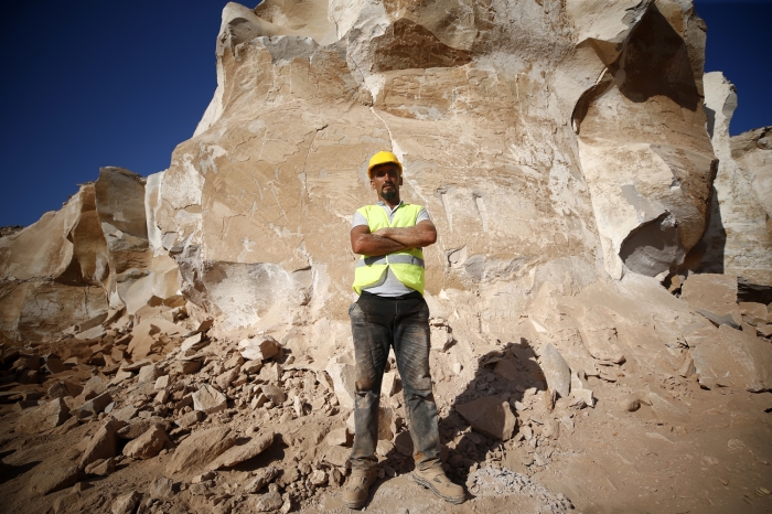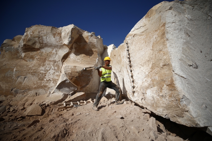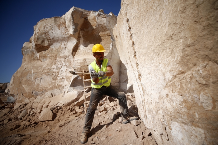 Ekmeğini "taş"tan çıkaran işçilerden Ahmet Tezcan (30), yerin altından iş makineleri yardımıyla çıkarılan devasa kayaları çekiç, balyoz ve çivi yardımıyla parçalıyor.