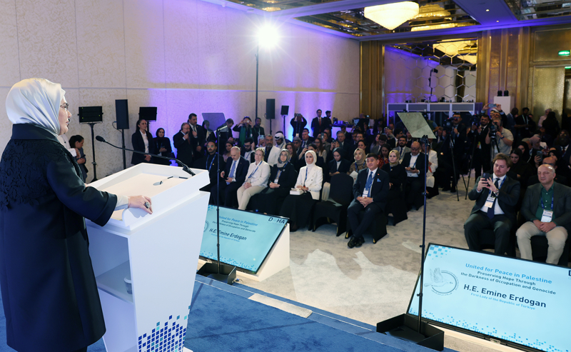 Emine Erdoğan, Cumhurbaşkanlığı Dolmabahçe Çalışma Ofisi'nde ev sahipliğini yaptığı, 15 devlet ve hükümet başkanı eşi ve özel temsilcilerin katılımıyla düzenlenen "Filistin İçin Tek Yürek" temalı zirvede konuklara hitap etmişti.