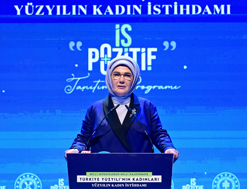 Çalışma ve Sosyal Güvenlik Bakanlığınca, Atatürk Kültür Merkezi'nde düzenlenen "Milli Müdafaadan Milli Kalkınmaya Türkiye Yüzyılı'nın Kadınları, Yüzyılın Kadın İstihdamı: İş-Pozitif"in tanıtım programında konuşan Emine Erdoğan, üreten, ürettikçe hem güçlenen hem güçlendiren, gözünün nurunu hayata katan kadınlarla buluşmaktan duyduğu memnuniyeti dile getirdi.