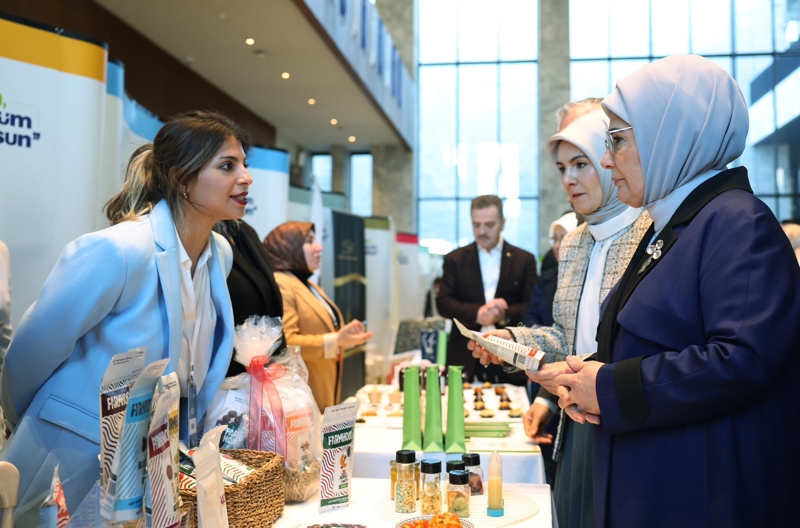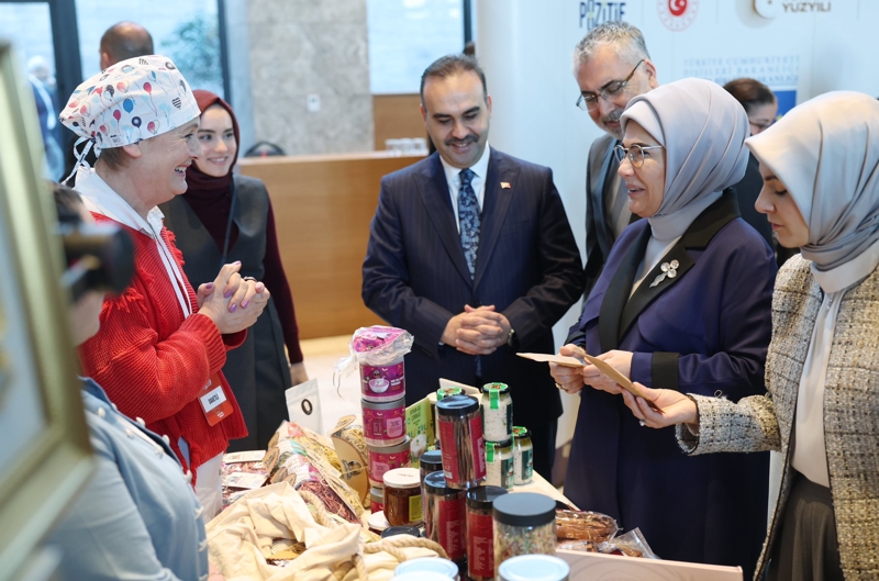 Emine Erdoğan, daha sonra İş Pozitif programı kapsamında projelerini hayata geçiren kadın girişimcilerin ürünlerinin tanıtıldığı standı gezdi. Burada girişimci kadınlardan hayata geçirdikleri projeler hakkında bilgi alan Emine Erdoğan, ortaya çıkarılan ürünleri tek tek inceledi.