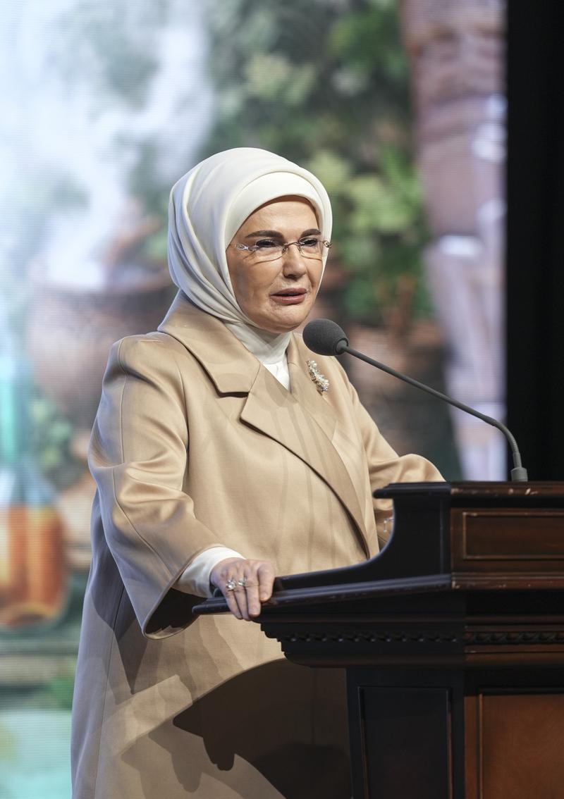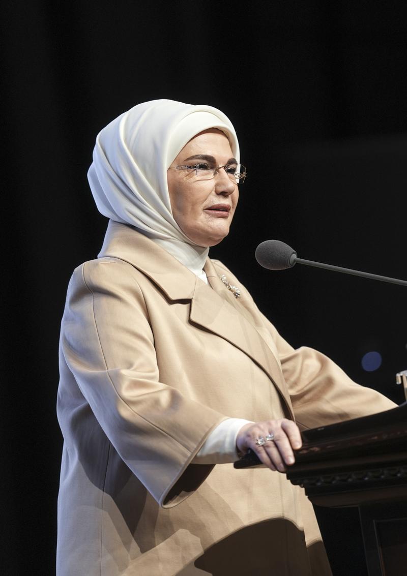Emine Erdoğan, programdaki konuşmasına, ufuk açıcı sempozyumu tertip eden Sağlık Bakanlığına, Cumhurbaşkanlığı Kültür ve Sanat Politikaları Kuruluna ve organizasyonda emeği geçen herkese teşekkür ederek başladı.