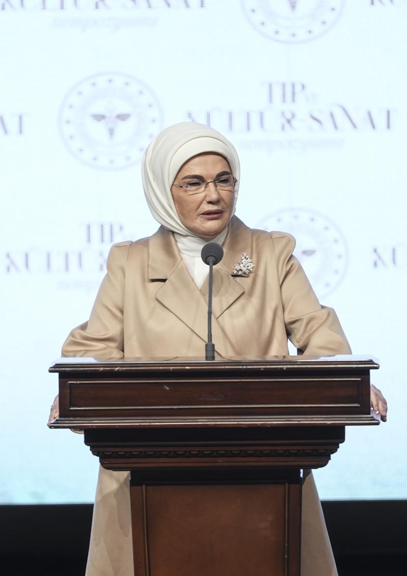 Konunun uzmanlarının da tıp eğitiminde insani bilimlerin yer almasının önemini vurguladığını aktaran Emine Erdoğan, "Çünkü insanın laboratuvar ortamında tahlil edilemeyecek yönlerini anlamak, ancak çok yönlü bir idrakle mümkün olabilir. İnanıyorum ki tıp ilmi, insani bilimlerden, sanattan, edebiyattan, felsefeden beslendikçe yalnızca hastalıkları değil, insanı bir bütün olarak iyileştiren özünü koruyacaktır." dedi.