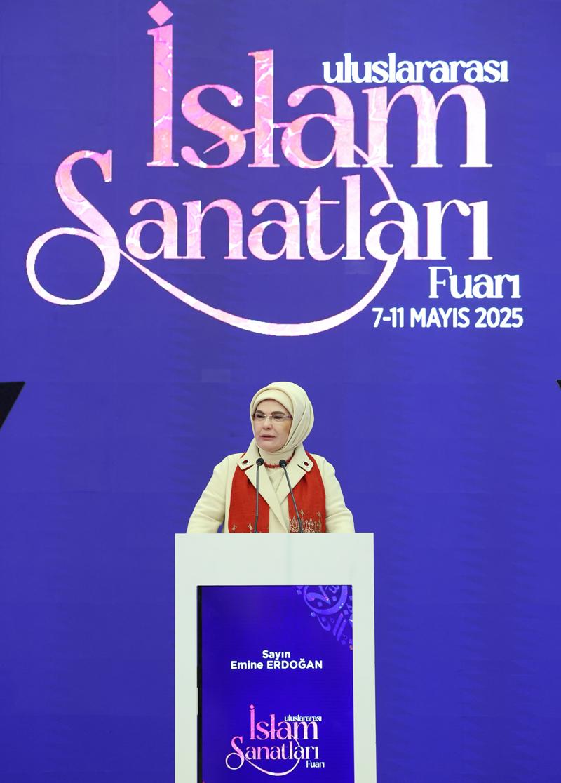 Hz. Muhammed'in bir hadisi şerifinde "Allah güzeldir, güzelliği sever." buyurduğuna işaret eden Emine Erdoğan, bu hadisin, İslam sanatının amacını, ilkelerini, ölçüsünü ve çerçevesini belirlediğini aktardı.