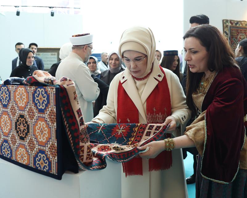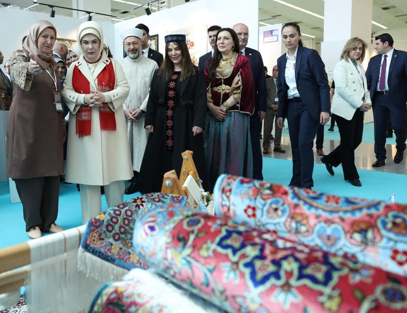 Azerbaycanlı sanatçıların eserlerinin sergilendiği standı ziyaret eden Emine Erdoğan, kadın sanatçıların ürettiği dokuma ürünlerini yakından inceledi, ürünlerin üretim süreci hakkında bilgi aldı.