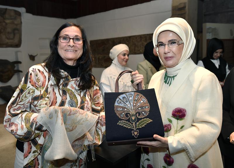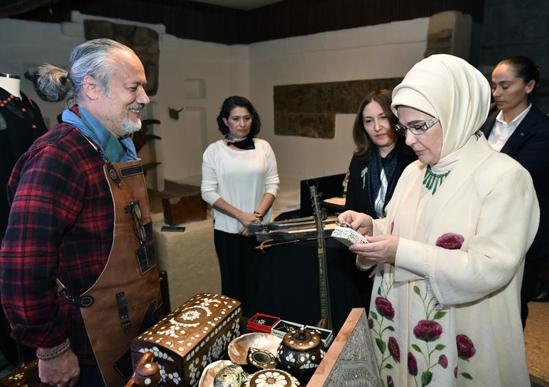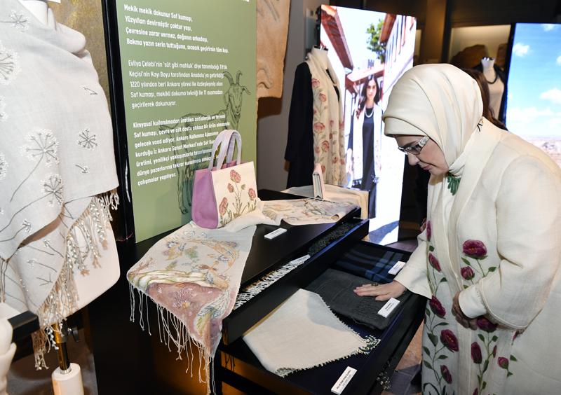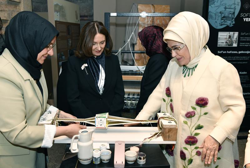Emine Erdoğan, konuşmasının öncesinde 35 parçalık koleksiyondan oluşan "Anadoludakiler: Sof'un Zamansız Yolculuğu Sergisi'nin açılışını yaparak ürünleri inceledi.