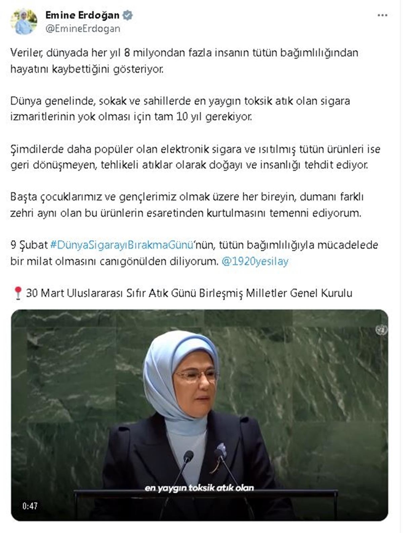 Emine Erdoğan, sosyal medya hesabından, 9 Şubat Sigarayı Bırakma Günü nedeniyle paylaşım yaptı. Erdoğan, dünyada her yıl 8 milyondan fazla insanın tütün bağımlılığından hayatını kaybettiğini belirterek, "Dünya genelinde, sokak ve sahillerde en yaygın toksik atık olan sigara izmaritlerinin yok olması için tam 10 yıl gerekiyor. Şimdilerde daha popüler olan elektronik sigara ve ısıtılmış tütün ürünleri ise geri dönüşmeyen, tehlikeli atıklar olarak doğayı ve insanlığı tehdit ediyor. Başta çocuklarımız ve gençlerimiz olmak üzere her bireyin, dumanı farklı zehri aynı olan bu ürünlerin esaretinden kurtulmasını temenni ediyorum. 9 Şubat Dünya Sigarayı Bırakma Günü'nün, tütün bağımlılığıyla mücadelede bir milat olmasını canıgönülden diliyorum" ifadelerini kullandı. Emine Erdoğan, 30 Mart Uluslararası Sıfır Atık Günü kapsamında Birleşmiş Milletler Genel Kurulu'nda sigara kullanımıyla ilgili yaptığı konuşmanın videosuna da paylaşımında yer verdi.