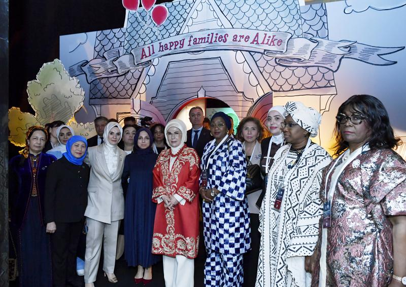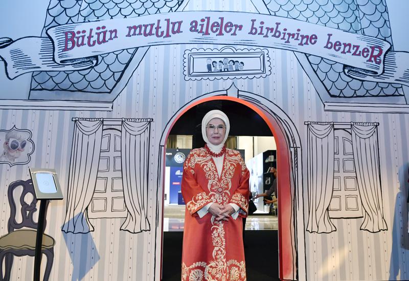 Stantlarda yer alan ürünleri inceleyen Emine Erdoğan, Bakanlığın hazırladığı "Tüm Mutlu Aileler Birbirine Benzer" temalı etkileşimli sergiyi de gezdi.