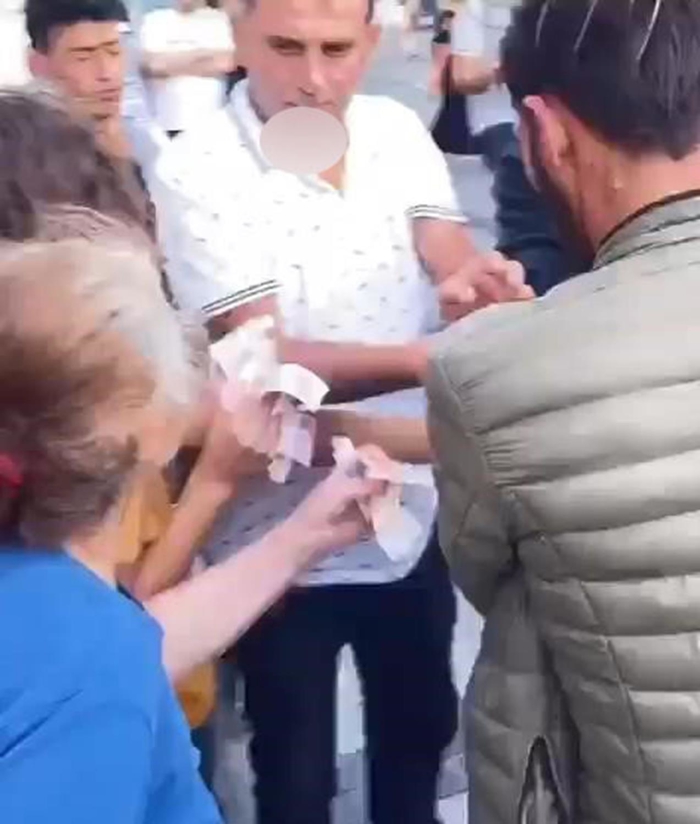 Çevredekiler paraları toplayıp poşete doldurdu. Paralar toplandıktan sonra aynı kişi, güvenlik görevlisinin elindeki para poşetini aldı.