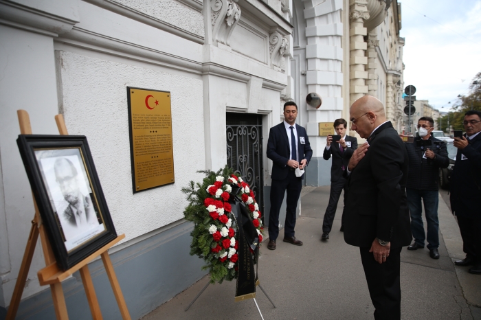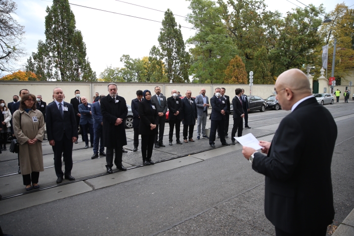 Viyana'da Ermeni teröristlerce şehit edilen 3 Türk diplomatın anısına elçiliğin dış cephesine yapılan plakete çelenk konulmasıyla başlayan törende, saygı duruşunun ardından şehitler için dua edildi.