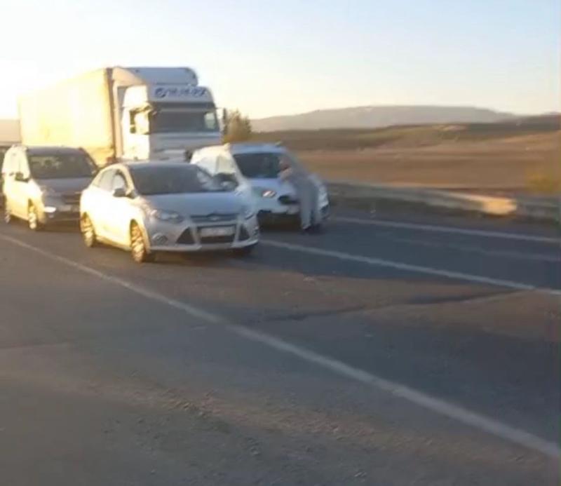 Erzurum'un Horasan ilçesinde Sanayi Kavşağı'nda trafikte bekleyen sürücüler, akıl almaz bir olaya tanık oldu.
