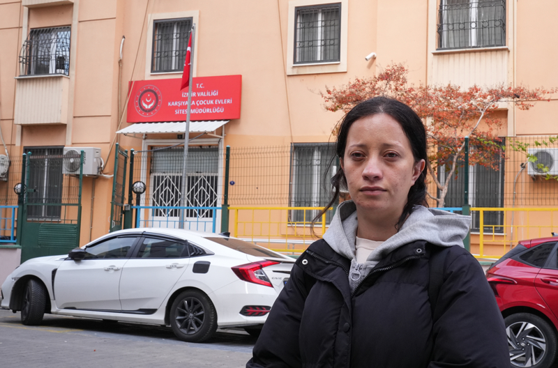 Burdur'da yaşayan ve zanlının dün tutuklanmasının ardından İzmir'e gelen Fatma A. (26), Aile ve Sosyal Hizmetler İl Müdürlüğünce koruma altına alınan çocuklarıyla görüşmek için Karşıyaka Çocuk Evleri Sitesi Müdürlüğüne geldi.