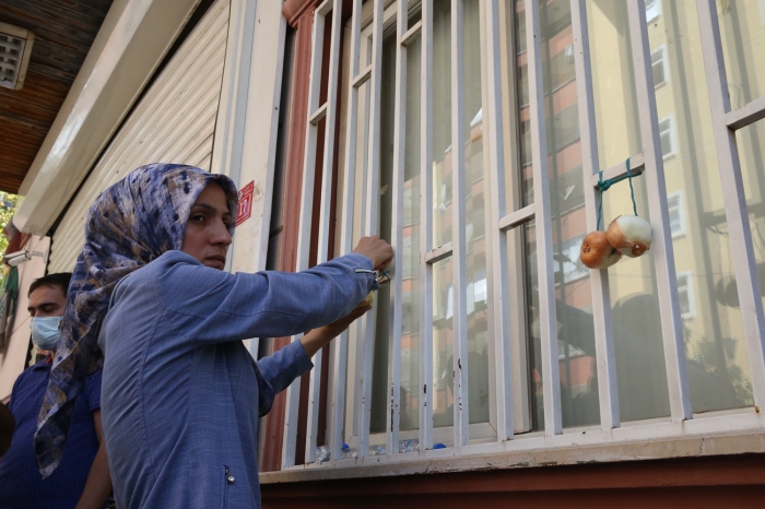 Daha sonra anne Biçer beraberinde getirdiği soğanı HDP il binasının pencere demirine astı.