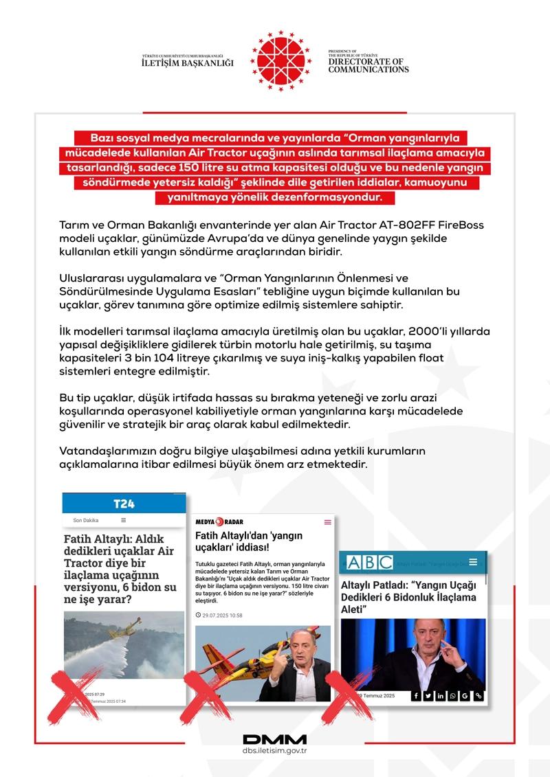 Dezenformasyonla Mücadele Merkezi, bazı sosyal medya mecralarında ve yayınlarda "Orman yangınlarıyla mücadelede kullanılan Air Tractor uçağının aslında tarımsal ilaçlama amacıyla tasarlandığı, sadece 150 litre su atma kapasitesi olduğu ve bu nedenle yangın söndürmede yetersiz kaldığı" şeklinde dile getirilen iddiaları yalanladı.