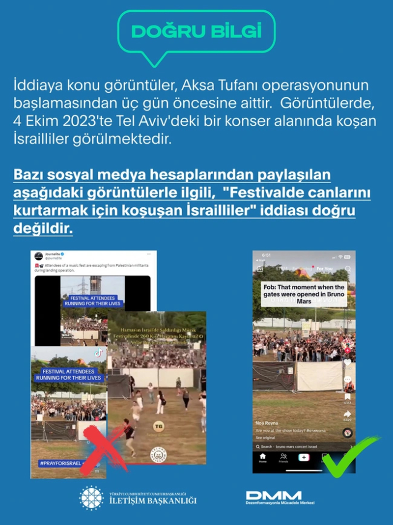 "Bazı sosyal medya hesaplarından paylaşılan aşağıdaki görüntülerle ilgili, "Festivalde canlarını kurtarmak için koşuşan İsrailliler" iddiası doğru değildir. İddiaya konu görüntüler, Aksa Tufanı operasyonunun başlamasından üç gün öncesine aittir. Görüntülerde, 4 Ekim 2023'te Tel Aviv'deki bir konser alanında koşan İsrailliler görülmektedir."