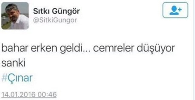 HDP Eşbaşkanı Yüksekdağ’ın ESP döneminden bu yana yanında olan danışmanı Güngör, lojmanda yaşayan kadın ve çocukların da yaralandığı saldırı sonrası “Bahar erken geldi… Cemreler düşüyor sanki… #Çınar” şeklinde tweet attı.