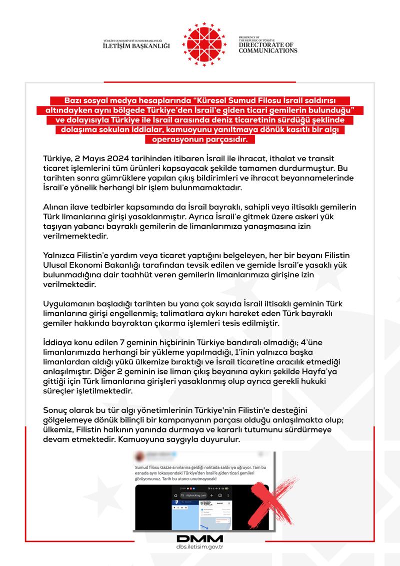 DMM'nin, NSosyal hesabından yapılan açıklamada, bazı sosyal medya hesaplarında "Küresel Sumud Filosu İsrail saldırısı altındayken, aynı bölgede Türkiye'den İsrail'e giden ticari gemilerin bulunduğu" ve dolayısıyla Türkiye ile İsrail arasında deniz ticaretinin sürdüğü şeklinde dolaşıma sokulan iddiaların kamuoyunu yanıltmaya dönük kasıtlı bir algı operasyonunun parçası olduğu belirtildi.