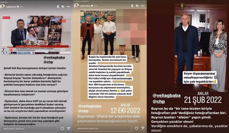 Eylül Öztürk ise Ağbaba'nın bu sözlerine tepki gösterdi. Mansur Yavaş ve Ekrem İmamoğlu ile fotoğraflarını paylaşan Öztürk, "Şimdi Veli Bey konuşmanızı dehşet içinde izledim. Birincisi benim adımı zikredip, fotoğrafımı sağ üst köşeye koyup 'bunlar dolandırıcı' demişsiniz. Kesinleşmiş bir karar yokken benimle ilgili bu şekilde konuşma hakkını size kim veriyor? İkincisi ben tam olarak ne zaman Umre'ye gitmişim ispatlamanızı istiyorum. Üçüncüsü, daha önce CHP'ye oy veren biri olarak görüyorum ki gerçekten dedikleri kadar varmış. CHP, Atatürk'ün kurduğu parti olmaktan çıkmıştır ve bu siz araştırma dahi yapmaktan acizmişsiniz! Bizden biriyle bir tane fotoğrafı yok demişsiniz, şimdi size yine hep yaptığım gibi belgeler ile konuşacağım" ifadelerini kullandı..