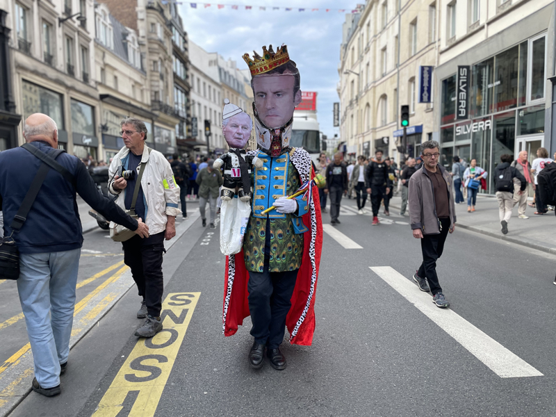 Macron'un başında taç olduğu fotoğrafın yer aldığı bir maske takan ve kral kostümü giyen gösterici dikkati çekti. Bu kişi, elinde Michel Barnier'nin yüzünün bulunduğu bir oyuncak tuttu.