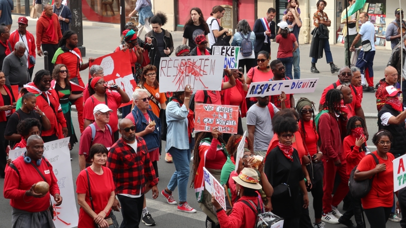 Fransa'nın sömürgeleri Yeni Kaledonya ve Martinik kökenli göstericiler de Paris'teki protestoya katıldı. Ada'lardaki hayat pahalılığına dikkati çeken bu göstericiler, Paris yönetiminin politikalarına tepki gösterdi ve "Bir gün sömürgeci, daima sömürgeci" yazılı pankartlar taşıdı.