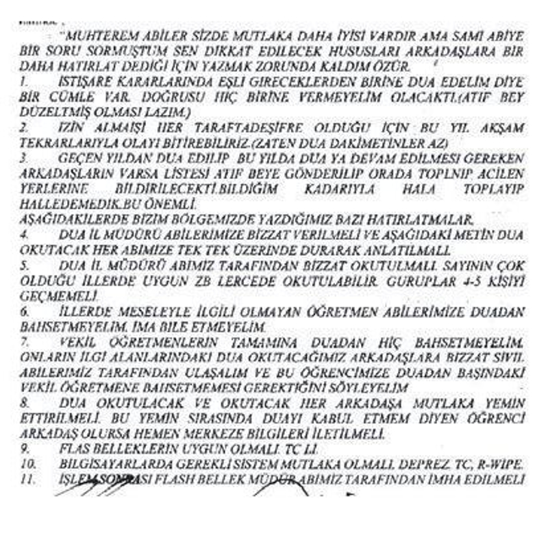 VERİLER arasında örgütün soru hırsızlığı bir kez daha belgelenmiş oldu. Kendisine gösterilen notlarla ilgili ifade veren "Garson" bilgilerin örgüt yönetimince oluşturulan gündem sonrasında sınava girecek Emniyet Genel Müdürlüğü personeline dua adı altında sınav sorularının verilmesiyle ilgili tutulan notlar olduğunu söyledi. Notlarda soruların nasıl verilmesi gerektiğinin tüm örgüt abilerine detaylı anlatılmasının istendiği görüldü.