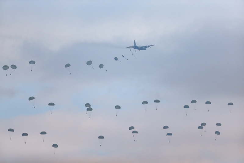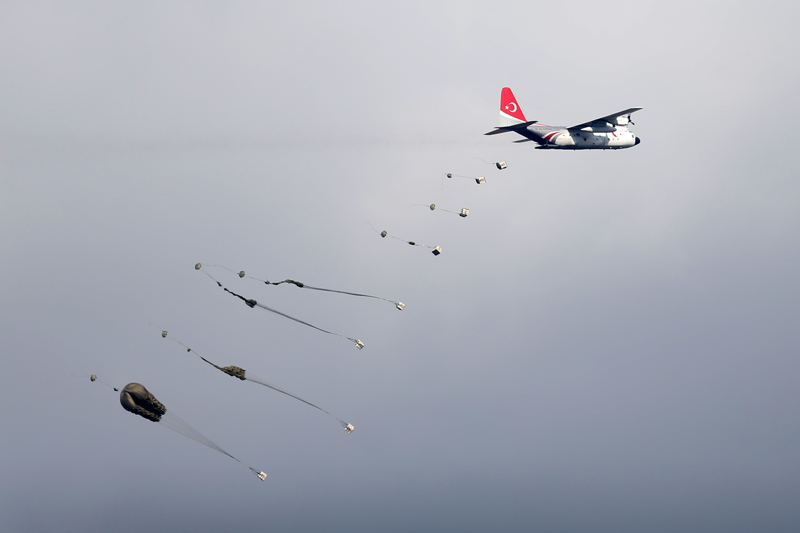 Tatbikat senaryosu kapsamında 12. Hava Ulaştırma Ana Üs Komutanlığından havalanan C-130 ve C-160 nakliye uçaklarındaki 180 paraşütçü komando, bölgeye indi.