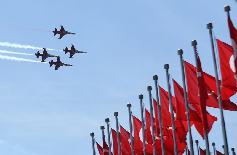 Şehitler Abidesi'nin yer aldığı Hisarlık Tepe'de toplananlar, ekiplerin savaş uçaklarıyla yaptığı gösteriyi ilgiyle takip etti.