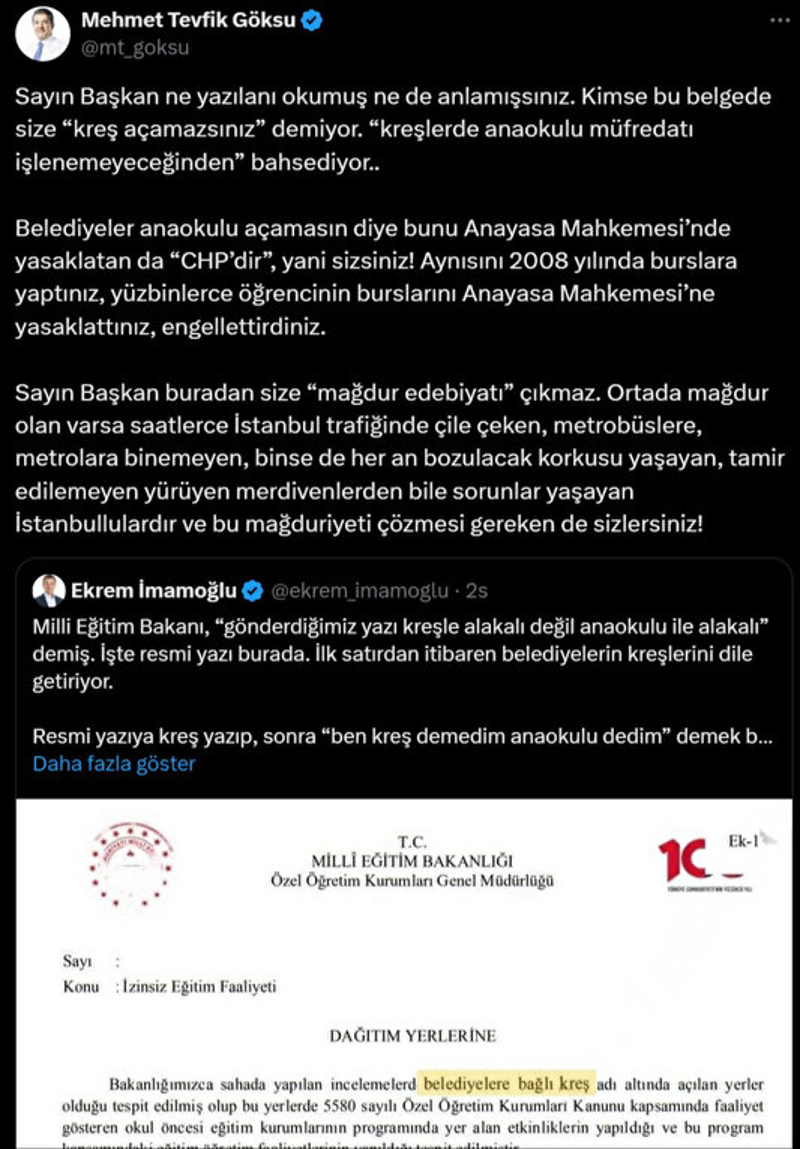 İmamoğlu, tüm iddialarına gelen yanıtlar sonrasında bir paylaşım daha yaparak, "Milli Eğitim Bakanı, "gönderdiğimiz yazı kreşle alakalı değil anaokulu ile alakalı" demiş. İşte resmi yazı burada. İlk satırdan itibaren belediyelerin kreşlerini dile getiriyor." ifadelerini kullandı.