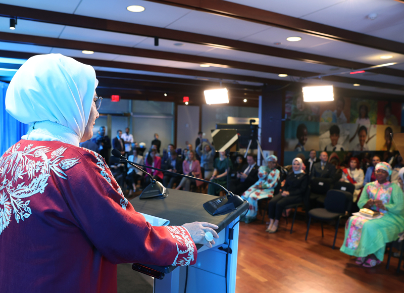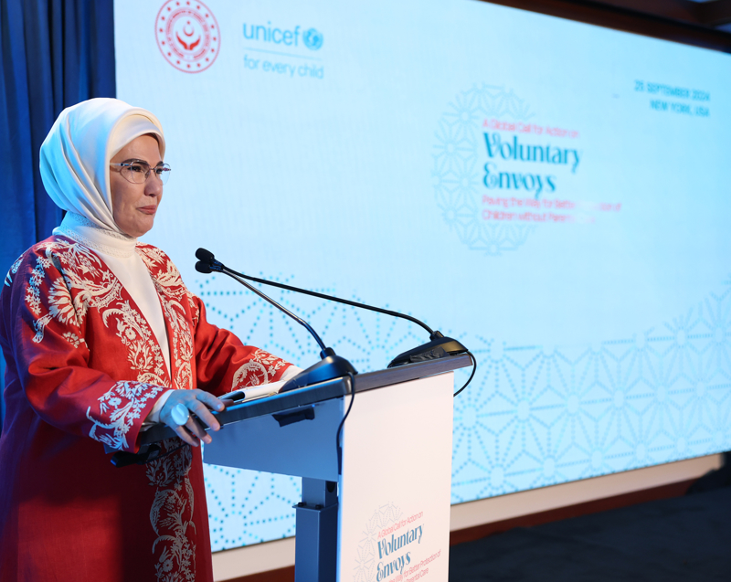 Emine Erdoğan, kendi himayelerinde, Aile ve Sosyal Hizmetler Bakanlığı ile UNICEF işbirliğiyle New York'taki UNICEF Genel Merkezi'nde düzenlenen "Bir Deniz Yıldızı Hikayesi: Gönül Elçilerine Küresel Davet" programında katılımcılara hitap etti.