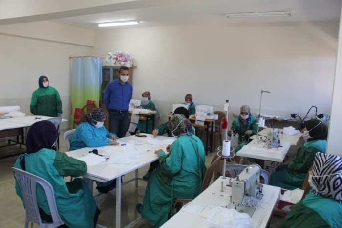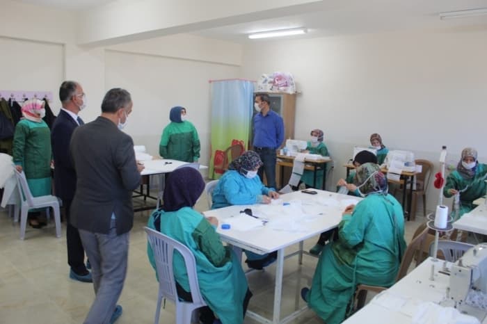 10 bin maske hedefiyle üertime başlatılan bu faaliyette şimdiye kadar 6 bin maske üretildiğini belirten Kaymakam Çiçek, ’’Günlük ortalama 500 maske üretimi yapılıyor. Bildiğiniz gibi tüm dünya virüs tehlikesinden geçiyor. Dünya Sağlık Örgütü de buna pandemi niteliğini koydu. Bundan en az zararla çıkmak için devletimiz süreci çok iyi yönetti. Bizler yereldeki yöneticiler olarak da, sağlıklı kalabilmek açısından hem bireysel hem de toplumsal hijyenimize dikkat ederek, sosyal mesafemizi koruyarak, yapmak zorunda olduğumuz işlerimiz dışında mümkün olduğunca evde kalarak bu tehlikeyi millet olarak en az zararla atlatacağız. Bu millet aziz bir millettir, sağduyulu bir millettir. Bu arkadaşlarımız bizim görünmez kahramanlarımız” dedi.