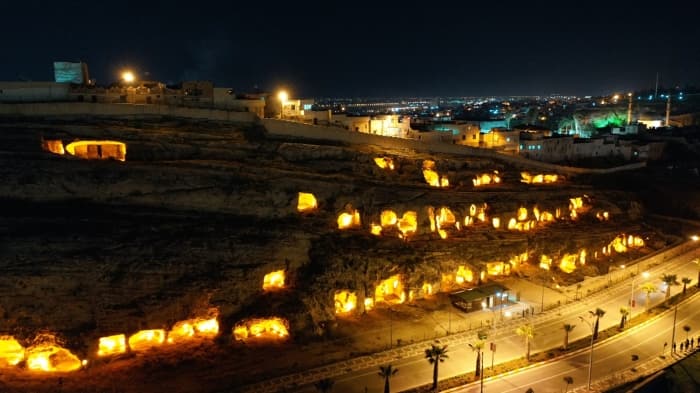 Tarihi şehrin gecelerine ayrı bir güzellik sağlayan Kızılkoyun mağaraları yeni görüntüsüyle görenleri adeta büyülüyor.