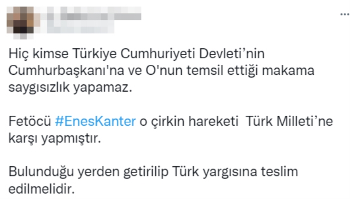 FETÖ'cü Enes Kanter, haddini aşarak Cumhurbaşkanı Erdoğan'ın fotoğrafının üstüne bastığı küstah bir paylaşımda bulunmuştu. İstanbul Cumhuriyet Başsavcılığı FETÖ'cü Kanter için harekete geçti. Savcılığın FETÖ firarisi Enes Kanter hakkında 'Cumhurbaşkanına hakaret'ten re'sen soruşturma başlattığı öğrenildi. O anları sosyal medyadan paylaşan FETÖ'cü Enes Kanter'e sosyal medyada her kesimden tepki yağdı