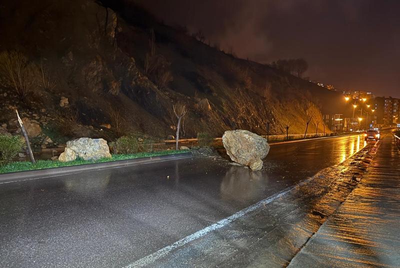 Hakkari'nin Şemdinli ilçesinde şiddetli sağanak yağış tehlikeli anlara neden oldu. Sanayi mevkisinde yamaçtan kopan büyük kaya parçası kara yoluna düşerken, Karayolları ve trafik ekipleri bölgeye sevk edildi. Kaya iş makinesiyle kaldırıldı ancak toprak kayması riski nedeniyle yolun bir şeridi trafiğe kapatıldı.