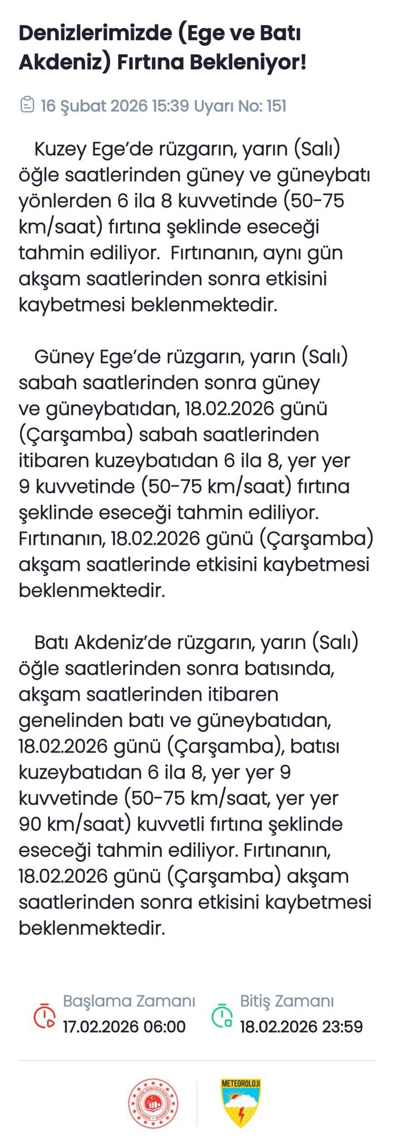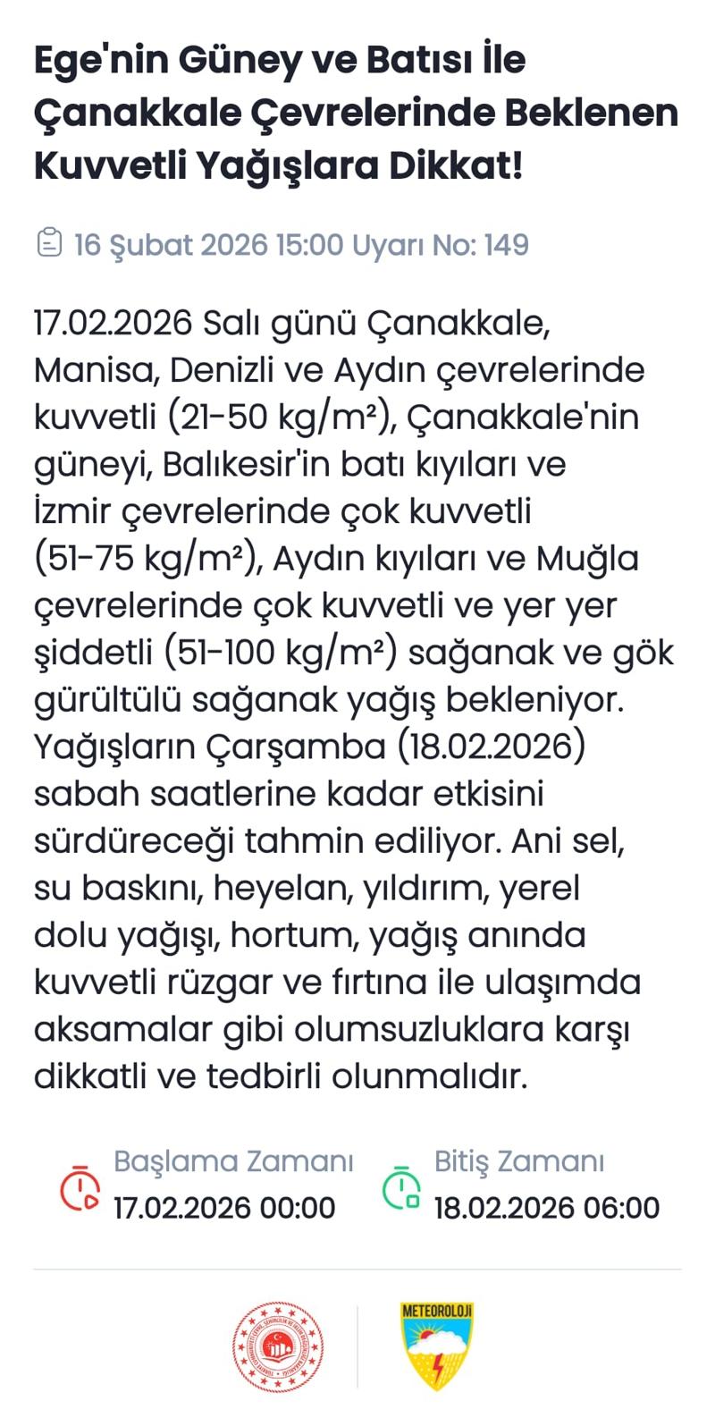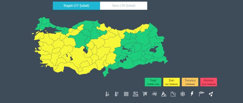 Yağışların, Marmara'nın batısı, Kıyı Ege ve Akdeniz bölgeleri ile İstanbul, Bursa, Çanakkale, Balıkesir'in batı kesimleri, Van'ın güney çevreleri ve Hakkari'de kuvvetli, Aydın'ın ve Muğla'nın kıyı kesimleri, Antalya'nın doğu ilçeleri, Çanakkale, İzmir'in güneyi ve Balıkesir'in batısında yer yer çok kuvvetli ve şiddetli olması bekleniyor. Bu sabah ve saatlerinde Doğu Anadolu'nun kuzeydoğusunda buzlanma ve don olayının görüleceği tahmin ediliyor. Doğu Karadeniz'in iç kesimlerinin yüksekleri ile Doğu Anadolu'nun doğusunda yüksek kar örtüsüne sahip eğimli kesimlerinde çığ tehlikesi ile kar erimesi tehlikesi bulunmaktadır. Orta ve Doğu Karadeniz'in iç kesimleri, Doğu ve Güneydoğu Anadolu'nun doğusunda toz taşınımının görüleceği tahmin ediliyor.
