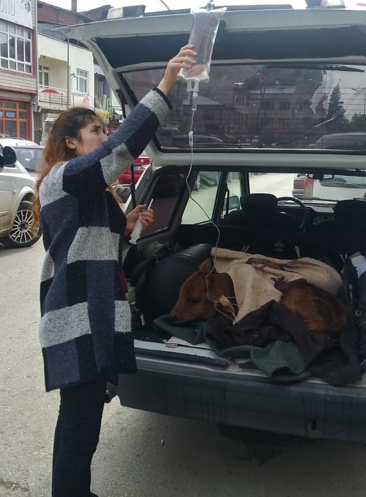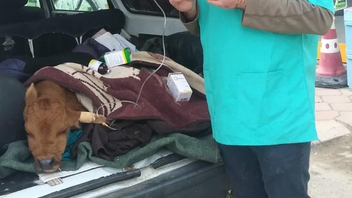 Burada yapılan muayenenin ardından sindirim sistemi bozukluğu yaşadığı belirlenen buzağıya aracın bagajında serum bağlanarak ilaç verildi.