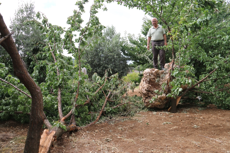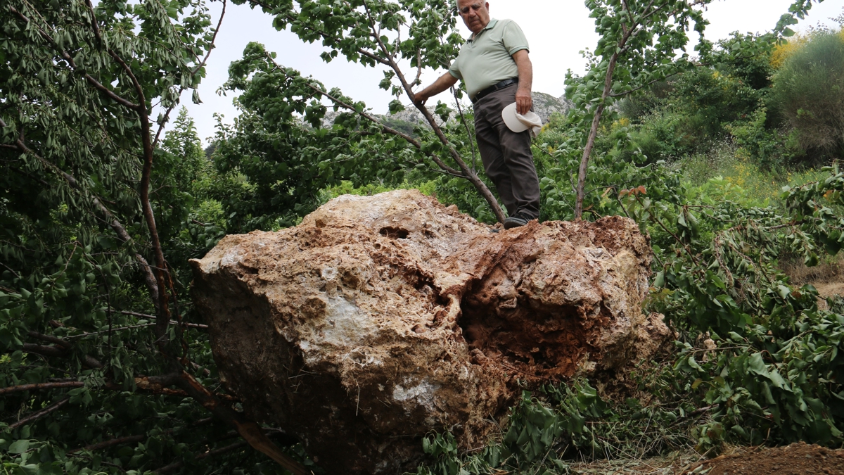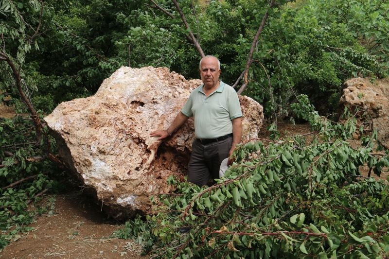 10 ton kaya parçasının bahçesine düştüğünü ifade eden Selahattin Altınöz, "Biz burada kayısı toplamaya geldik. Birdenbire uçarak üstümüze geldi. Nereden geldiğini biliyoruz ama ne zaman geleceğini kimse bilmiyor. Çünkü yukarıda taş ocağı var. Ben mimarım ve teknik şeyleri anlarım. Aşağı yukarı bu taş 4 metreküp. 4 metreküp bir taşın özgül ağırlığı 2,5 ton metreküp bu da 10 ton civarında. Tabii ki korktuk ben o anda burada değildim ama bizimkiler kaçıştılar. Hatta bir kova kayısı vardı dökülmüştü. Bu yeniydi ama 10-15 gün önce komşumuzun bahçesinde aynı şey oldu. Komşumun orada evi yok. Ev olmadığı için sadece ağaçlara zarar verildi" dedi.
