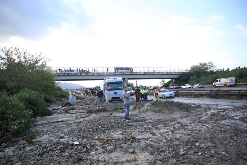 Sağanağın etkisiyle yükseklerden gelen çamur nedeniyle kapanan Toprakkale-İskenderun Otoyolu'nun Payas-Dörtyol mevkisinde trafik akışı tek şeritten sağlanıyor.