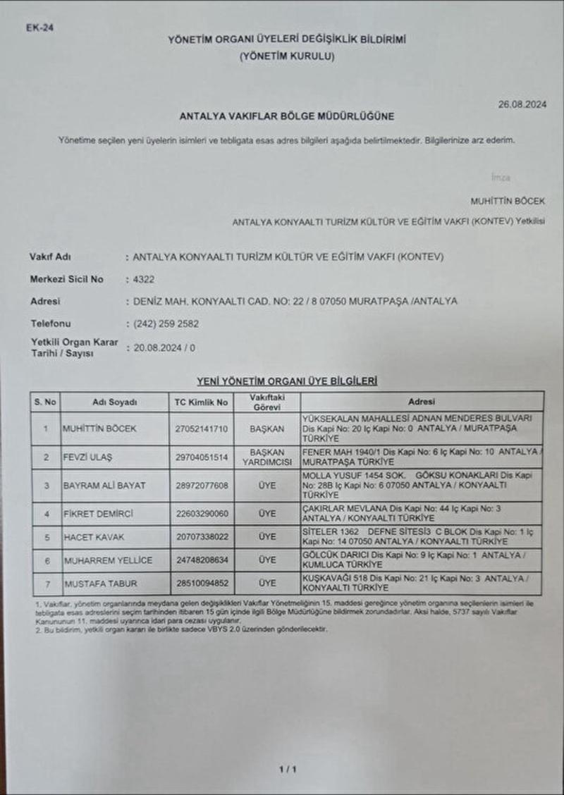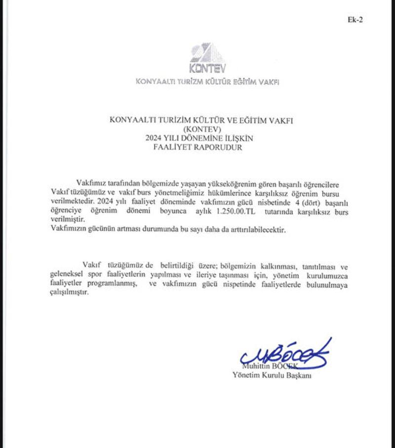Paraların gönderildiği Konyaaltı Turizm Kültür ve Eğitim Vakfı'nın, Muhittin Böcek tarafından yeniden aktifleştirildiği, vakfın başkanının Böcek, genel müdürünün ise Antalya Büyükşehir Belediyesi Genel Sekreteri Cansel Tuncer olduğu belirlendi. Eğitim bağışı adı altında milyonlarca lira alan vakfın, Vakıflar Genel Müdürlüğü kayıtlarına göre bugüne kadar yalnızca 4 öğrenciye eğitim desteği sağladığı belirlendi.