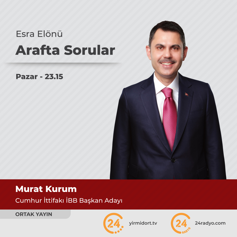 "Bizi tarafın değil arafın ilgilendiriyor" diyen Esra Elönü'nün hazırlayıp sunduğu, Cumhur İttifakı İBB Başkan Adayı Murat Kurum'un konuk olacağı Arafta Sorular; 24 Mart Pazar saat 23.15'te 24 TV ve 24 Radyo ortak yayınında.