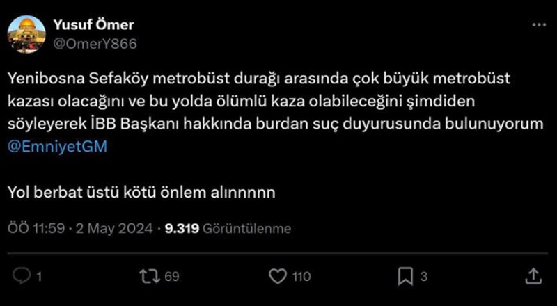 X'te paylaşım yapan 'Yusuf Ömer' adlı vatandaş2 Mayıs 2024 tarihinde yaptığı paylaşımda kaza yaşanabileceğini belirterek şunları yazmış: Yenibosna Sefaköy metrobüs durağı arasında çok büyük metrobüs kazası olacağını ve bu yolda ölümlü kaza olabileceğini şimdiden söyleyerek İBB Başkanı hakkında buradan suç duyurusunda bulunuyorum.