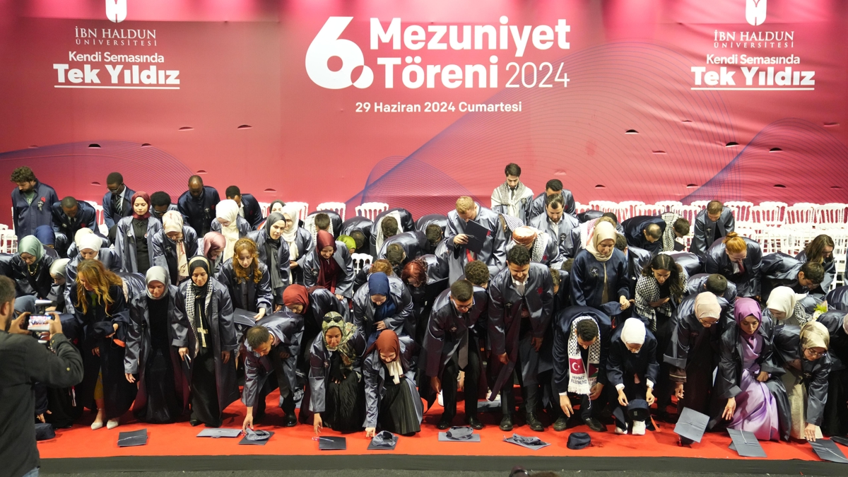 Üniversitenin Başakşehir'deki külliyesinde yapılan törende, İHÜ mezunları ve akademisyenleri cübbelerinde Gazzeli şehit öğrenci ve akademisyenlerin isimlerinin yazılı olduğu birer kokart taşıdı.