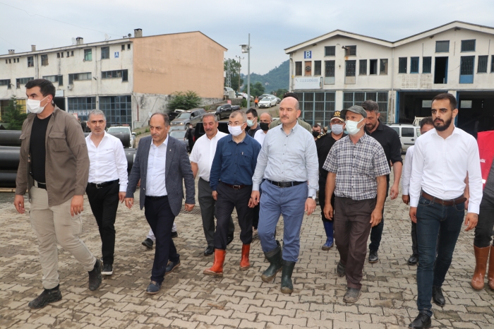 Bakan Soylu, daha sonra Arhavi Sanayi Sitesi'nde selde iş yerleri hasar gören esnafın sorunlarını dinledi, hasar oluşan çay fabrikasını ziyaret etti.