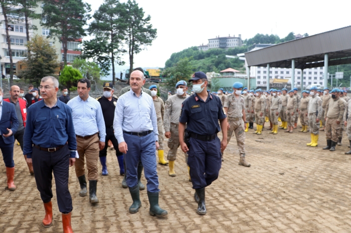 Arhavi Jandarma Komutanlığı'nı ziyaret eden Soylu, selde arama kurtarma ve temizlik çalışmalarında fedakarca görev yapan jandarma ekiplerine teşekkür etti.