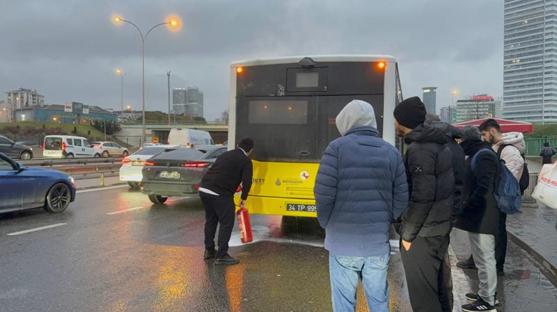 Göztepe Kavşağı'nda durağa yolcu almak için yanaşan 34 TP 9951 plakalı İETT otobüsünün motor kısmından henüz bilinmeyen nedenle duman yükseldi.
