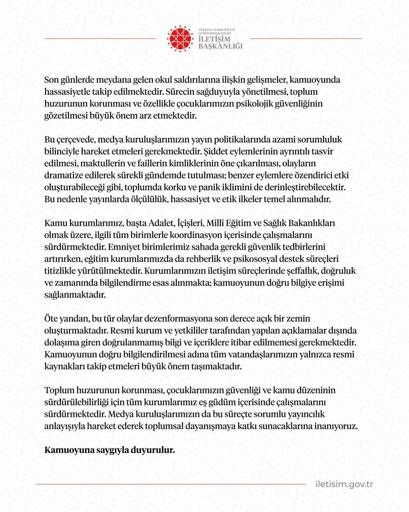Son günlerde meydana gelen okul saldırılarına ilişkin gelişmeler, kamuoyunda hassasiyetle takip edilmektedir. Sürecin sağduyuyla yönetilmesi, toplum huzurunun korunması ve özellikle çocuklarımızın psikolojik güvenliğinin gözetilmesi büyük önem arz etmektedir.