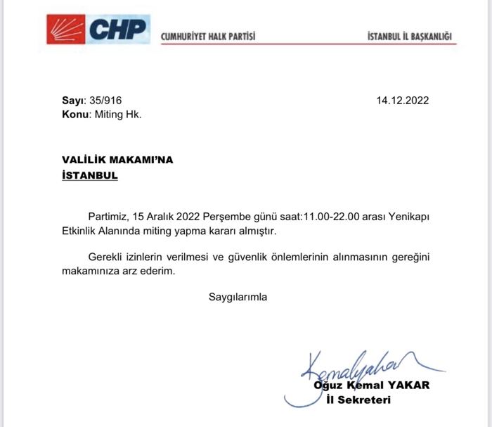 CHP İl Başkanlığı tarafından İstanbul Valiliği'ne gönderilen yazıda, CHP'nin 15 Aralık Perşembe günü için Yenikapı Etkinlik Alanı'nda miting düzenleme kararı aldığı açıklandı.