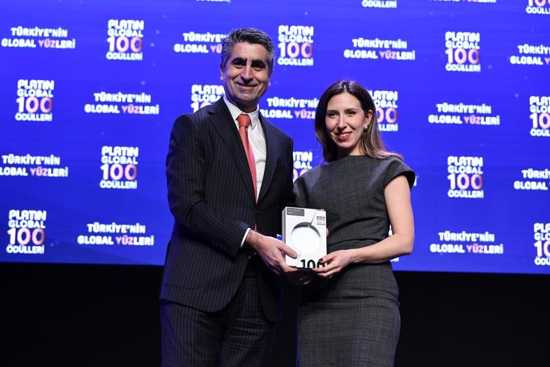 Platin Dergisi Genel Yayın Yönetmeni Bahar Akgün, ödülü Kazancı Holding Kurumsal İletişim Direktörü Fırat Gazel'e takdim etti.