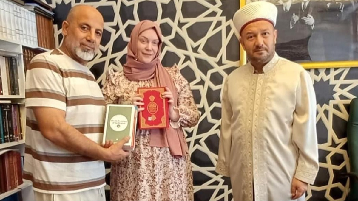 Müftü Kapancı, İskoçya vatandaşı Joannah Laura Morgan'a "İhtida Belgesi" ile birlikte Kur'an-ı Kerim meali ve çeşitli kitaplar hediye etti.